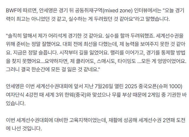 赛后安洗莹接受采访时说道:我现在真的要累虚脱了,老实说为了保住我那些头衔,我已经做了我能做的一切。【而韩国媒体并没有放过安洗莹,他们开始了各种冷嘲热讽】