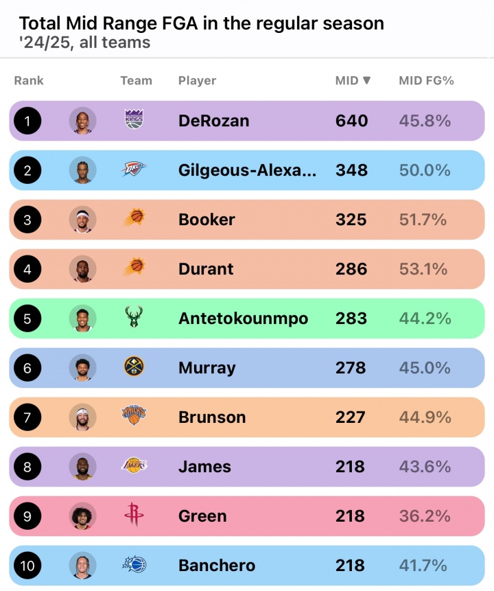 有趣的是,上赛季的中投出手数前五排名分别是:德罗赞(640)、亚历山大(348)、布克(325)、杜兰特(286)、字母哥(283)。